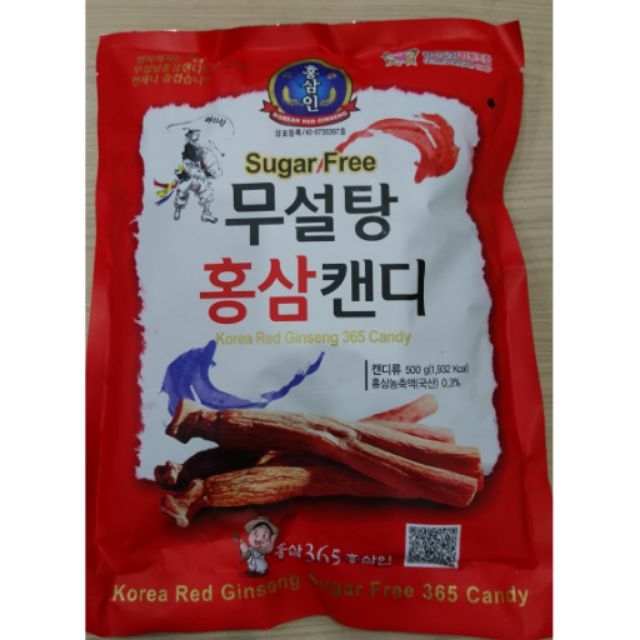 Kẹo hồng sâm không đường sugar free 365 candy chiết xuất hồng sâm (thành phần rắn 60%, hàm lượng saponin 70mg/g, Hàn Quốc) chiếm 1%, syrô bắp, hương hồng sâm thảo dược…