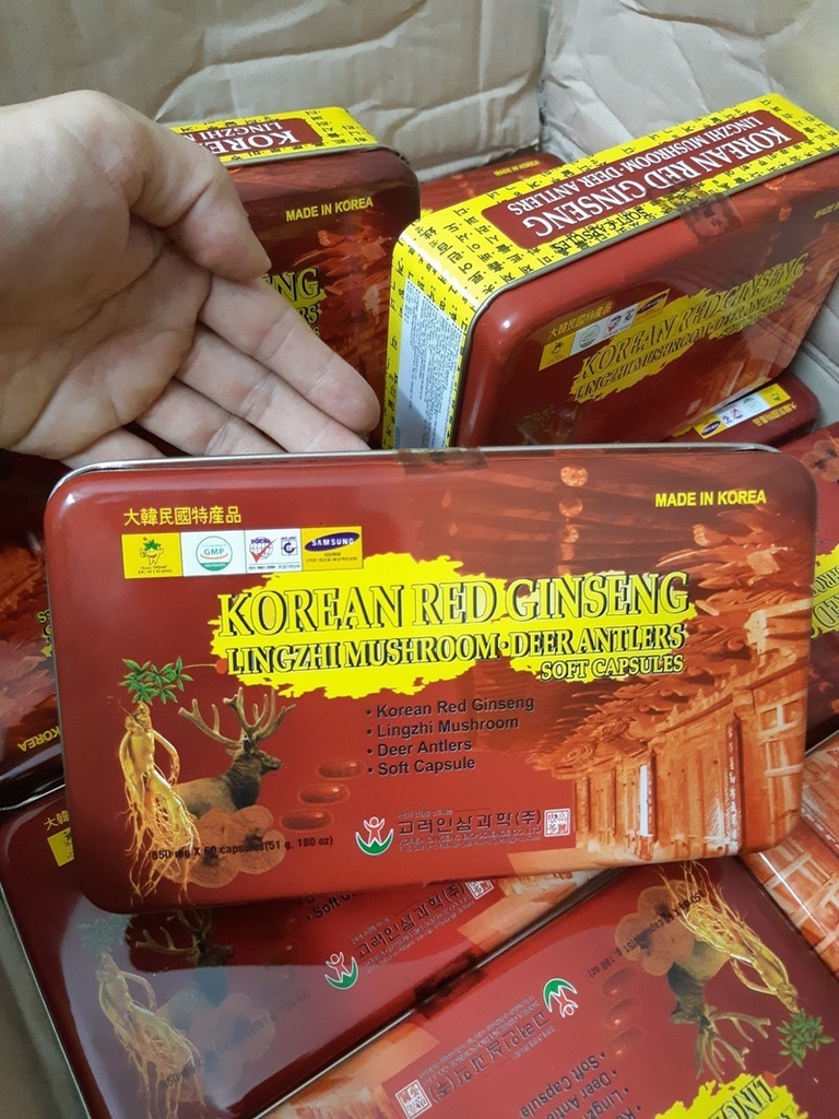 Trình bày: Hộp sắt 60 viên hồng sâm linh chi nhung hươu 850mg(51gr, 180 oz)